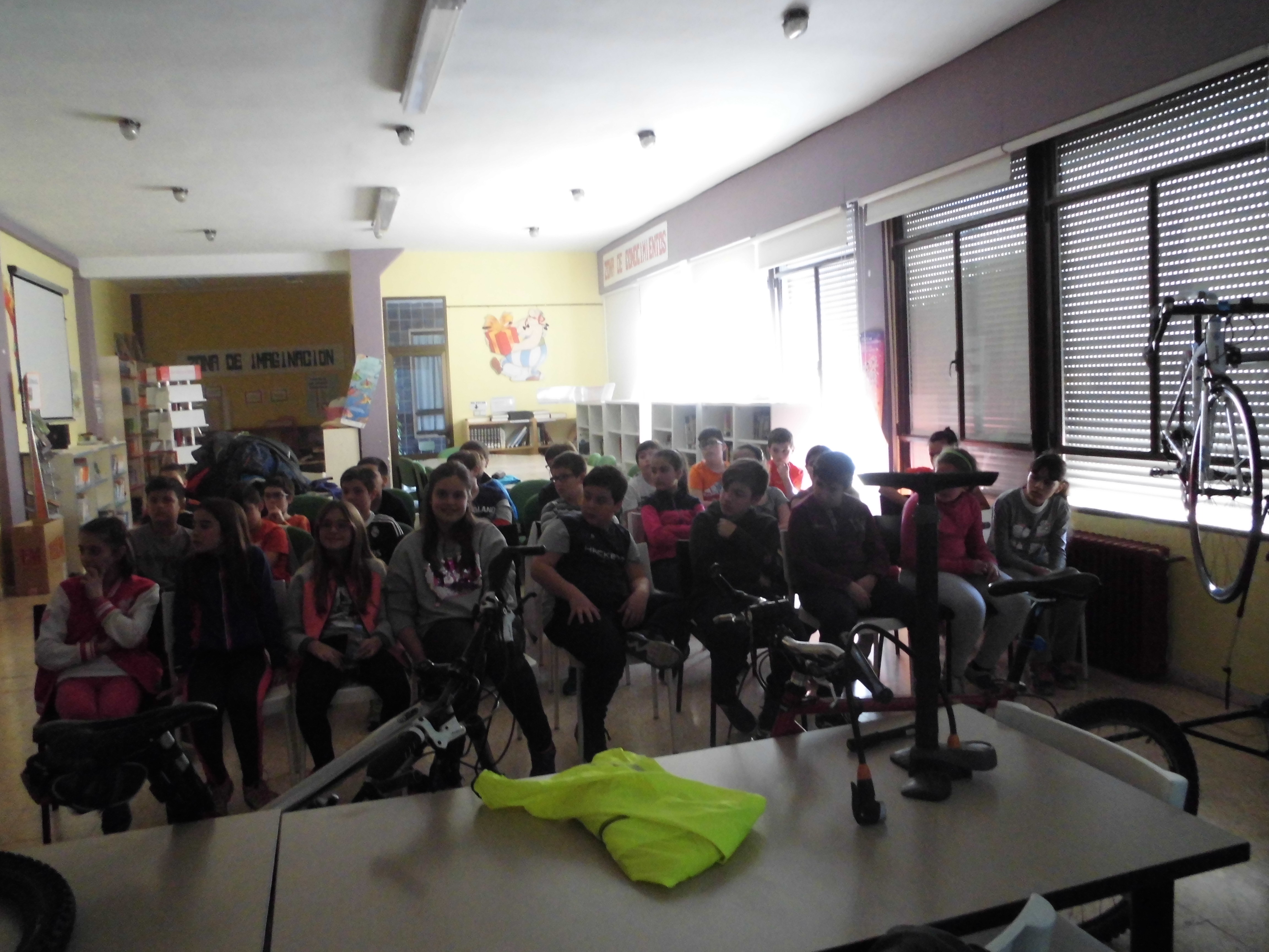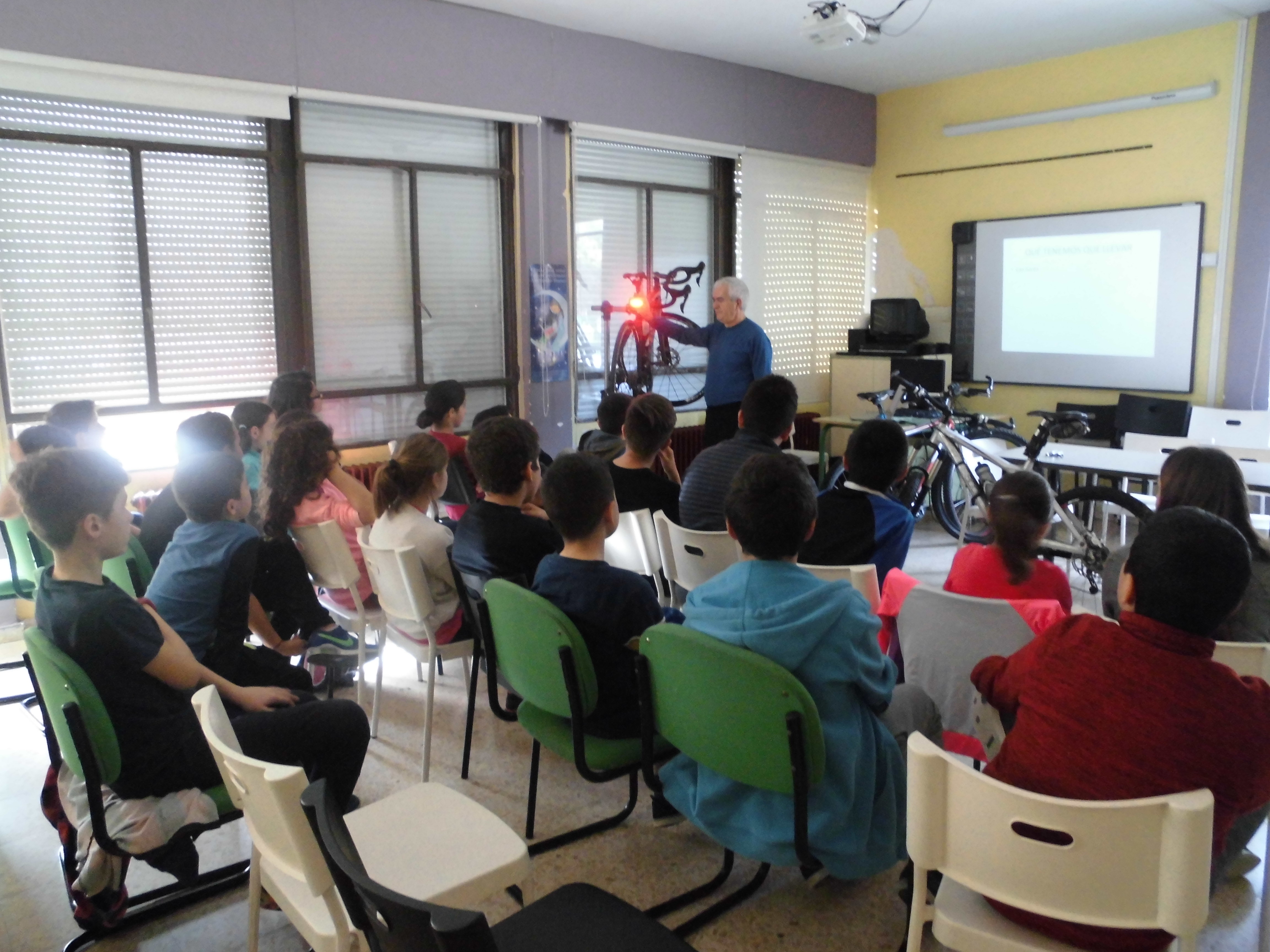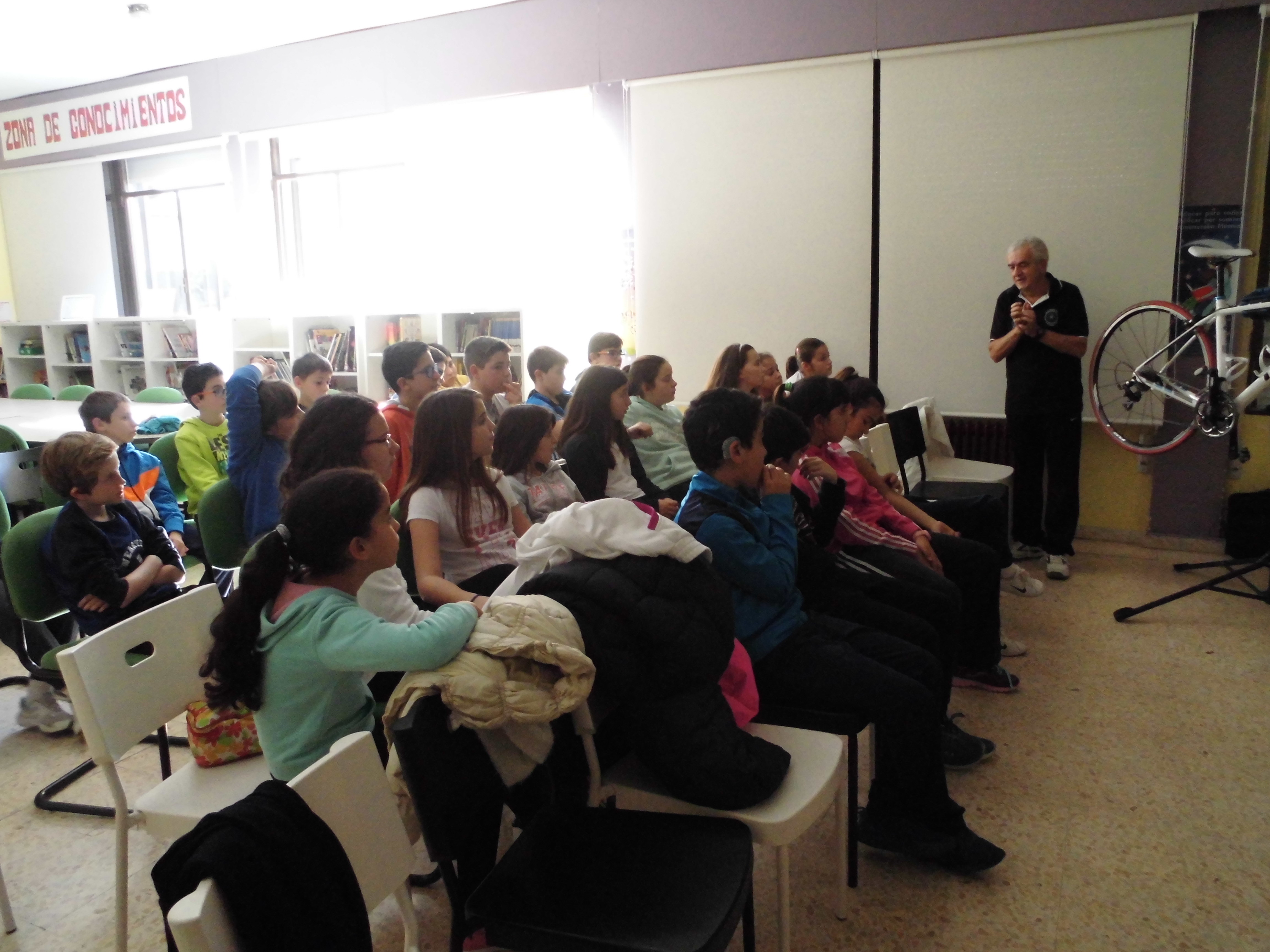 Este año, como en otros anteriores, realizaremos actividades de bici para el mes de mayo. Aprovechando que en Fuentes de Ebro tenemos un club ciclista bien organizado y tienen la disposición de colaborar con nosotros, tanto el alumnado de 5º como el de 6º ha recibido una charla-taller sobre la historia de la bicicleta, sus componentes, manejo de marchas, qué hay que llevar, prevenciones, cambiar un pinchazo…
