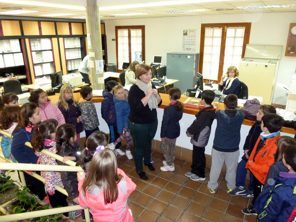 En la puerta del Ayuntamiento nos esperaba nuestra alcaldesa que nos enseñó el libro de registro de los habitantes del pueblo. Ahí  aparecen todos los datos de las personas nacidas en el pueblo. Esta es la primera planta, donde trabajan varias mujeres y atienden al público.