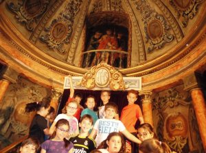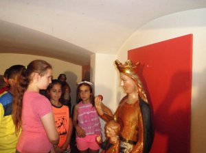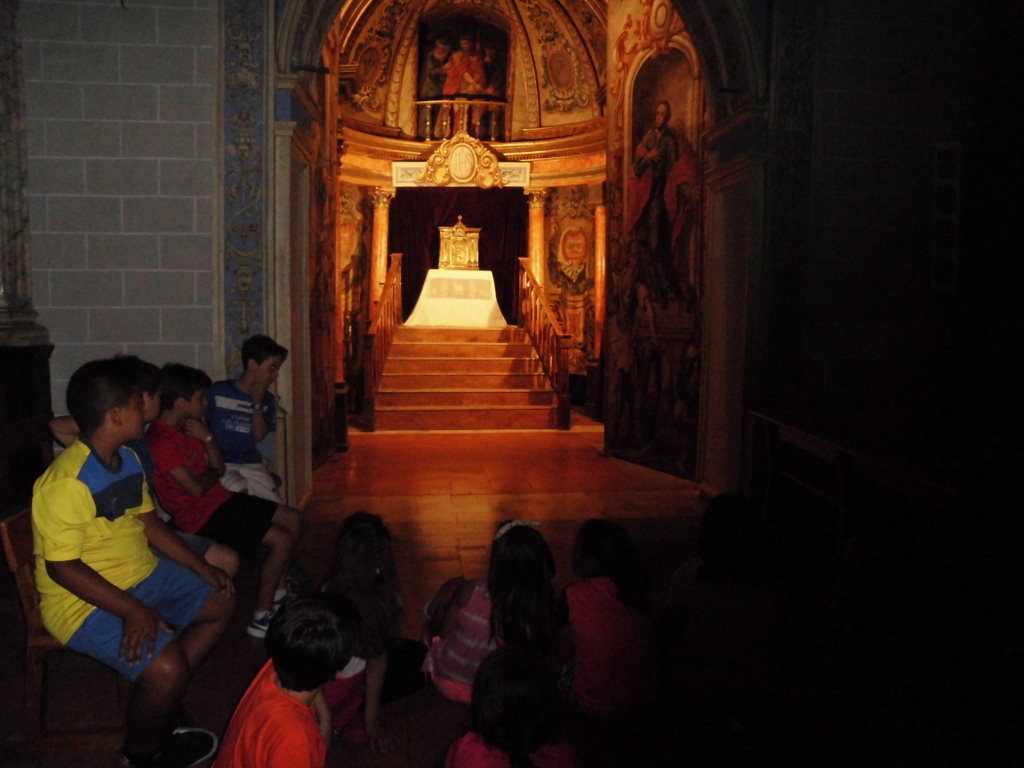 Descubrir enterramientos en el suelo de la iglesia, mirar hacia el techo y ver unos dados y herramientas pintadas, bajar a la cripta y observar una escultura románica de casi 300 años, etc…Todo eso y más hemos tenido la oportunidad de aprender en nuestro paseo por la iglesia.
