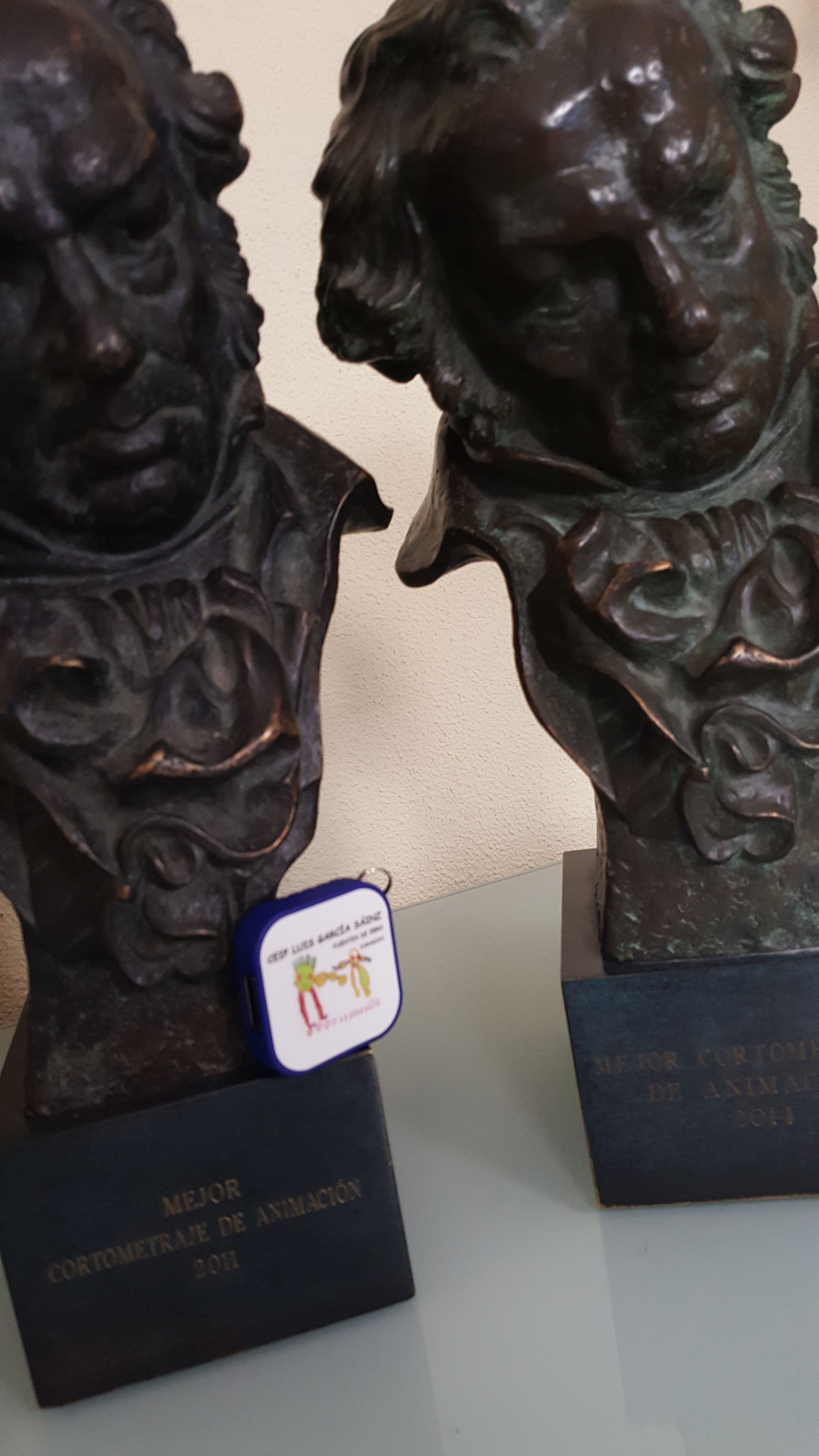 Desde el centro se le hizo llegar un USB con el logo del colegio, en agradecimiento a su charla-taller de cine de animación. Pedro ha tenido el detalle de enviarnos una foto con el USB entre sus dos Goyas. ¡Todo un honor para nosotros!