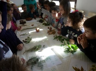 Después estuvimos en la salita multiusos. Alli observamos muchas semillas, hojas y frutos de diferente plantas de nuestro pueblo. Algunas las probamos, como la granada, muchas no se pueden comer. Eran muy variadas y bonitas.
