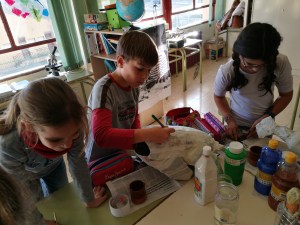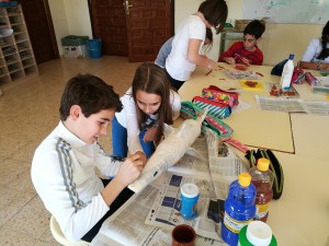Pues aquí andamos , manos a la obra, dándole forma, color y realismo a los animales prehistóricos que comenzamos con la ayuda de Mari Paz y Patricia.