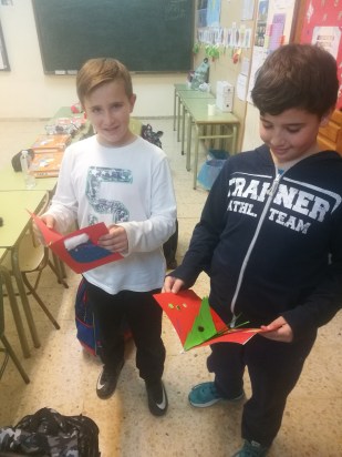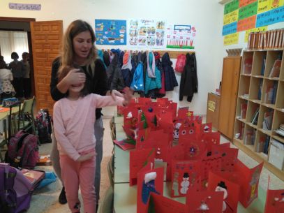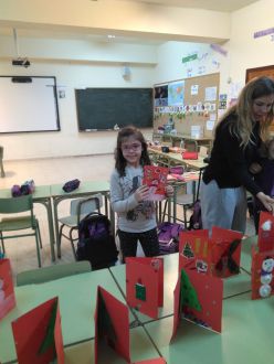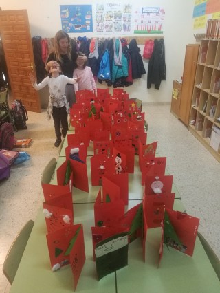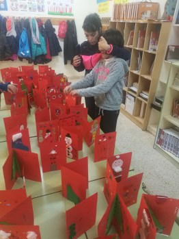 Las chicas y chicos de 3º han estado realizando durante varias sesiones una postal navidad, de la forma más creativa posible, con materiales super ingeniosos, pensando en dedicatorias escritas con mucho cariño; y sólo faltaba juntarnos todos/as para llevarnos a casa, un trocito de «cariño» de otro compi, en forma de postal.