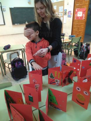 Y «pasito a pasito» hemos ido entrando en otra clase con ojos cerrados para recoger una postal.