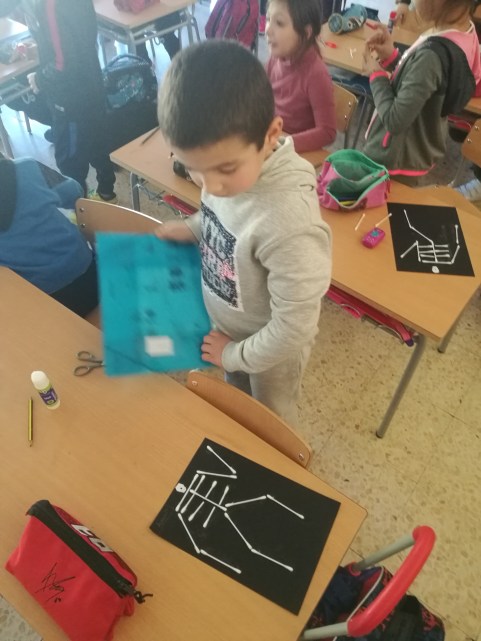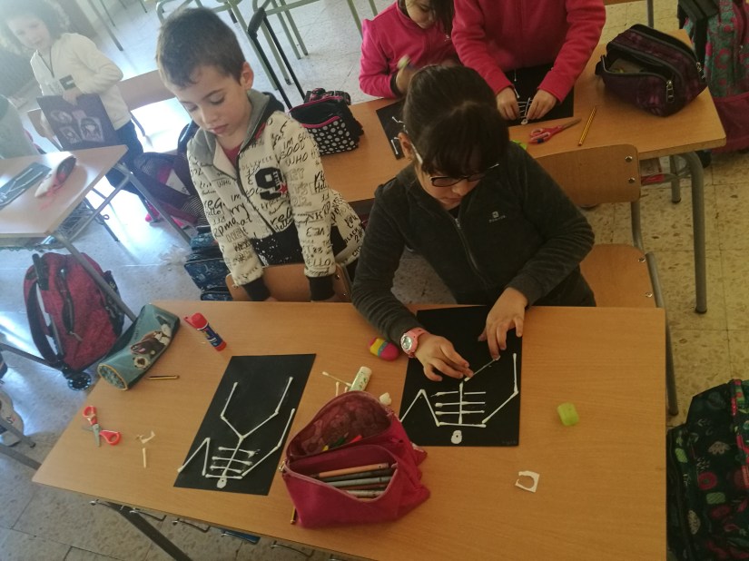 En este caso, hemos hablado en clase sobre la importancia de llevar bien la mochila, sentarse correctamente o coger algo pesado del suelo, para desarrollar los buenos hábitos posturales. Hemos estado observando radiografías, recordando o aprendiendo huesos del cuerpo humano, como hacen los verdaderos médicos, y hemos finalizado la sesión construyendo un esqueleto con ¡¡¡bastoncillos de los oidos!!!