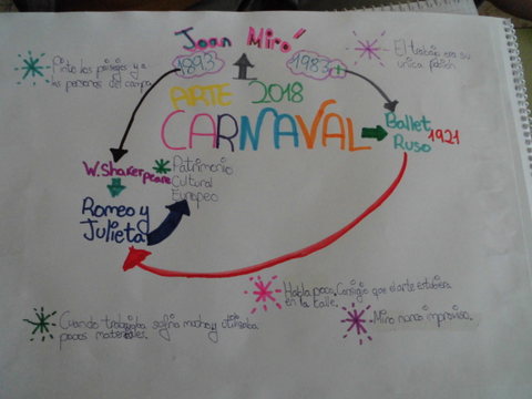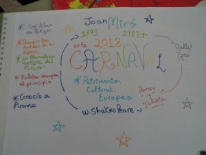 En la inclusión de 6º del mes de enero estuvimos conociendo a Joan Miró, e inspirándonos en él realizamos algunos trabajos: un mapa mental con datos de su biografía y diseño de un traje. Algun@s utilizaron lo aprendido para poner títulos en algún cuaderno….