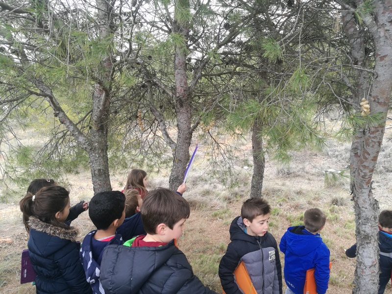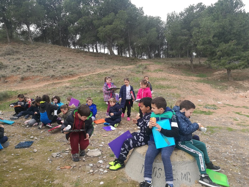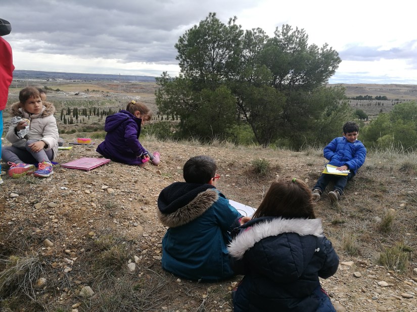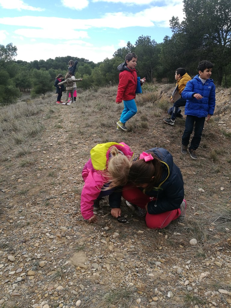 Hemos aprendido para qué sirve el alabastro, hemos visto cacahuetes colgados en algunos pinos para que otros animales se puedan alimentar, hemos observado con lupas rocas y seres vivos, hemos mirado con los prismáticos «HASTA EL INFINITO Y MÁS ALLÁ«, hemos compartido almuerzos y comentarios, hemos visto los montes que están un poco más lejos, los campos de cultivo, los nidos naturales y artificiales que hay para pájaros en algunos árboles, hemos visto a las cigüeñas detenerse en el aire adaptándose a las corrientes de aire, y a otras,posadas en sus nidos, escuchar su escuchado el sonido que hacen con su pico, llamado «crotoreo» o «claqueteo«; hemos imaginado objetos o animales viendo las nubes pasar,hemos pasado un gran día y también hemos sentido el olor del tomillo y hemos escuchado el cantar de los pájaros, , hemos disfrutado todos juntos/as como clase y seguramente otras cosas más que ahora no recordamos….