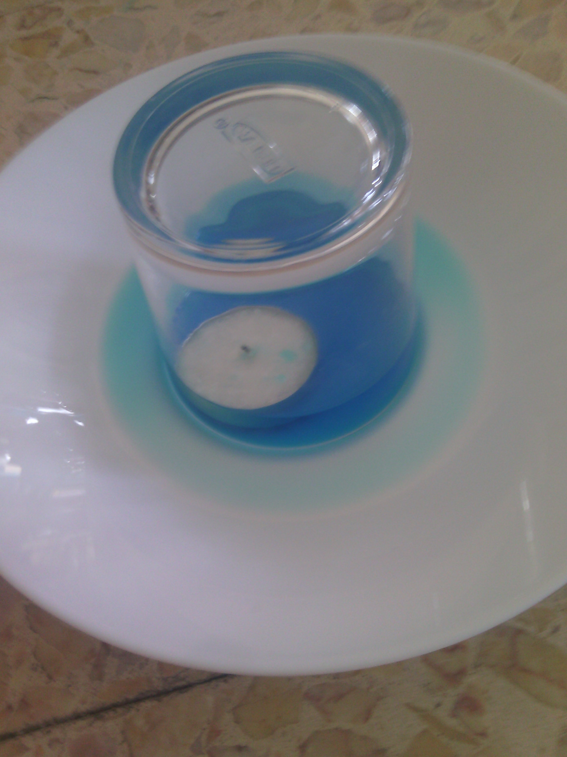 Al cabo de unos pocos segundos la vela se apaga pues se ha consumido el oxígeno y por ello el espacio que ocupaba ese gas es vuelto a ocupar por el agua del plato que asciende por el vaso