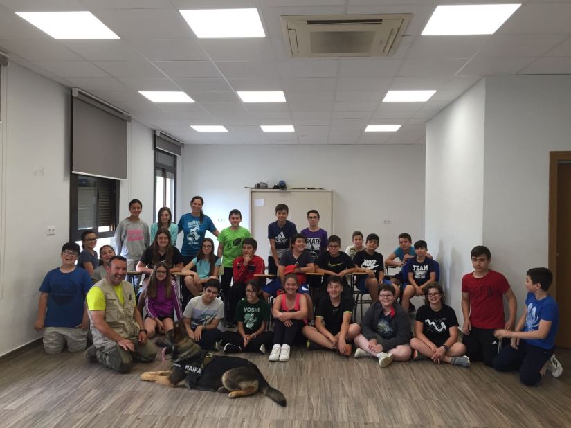 Con la otra clase no fue posible acudir allí, ya que el camino estaba muy embarrado. Así que, José Antonio, amablemente, vino al colegio. Nos mostró una de sus aves rapaces, material y jerga de cetrería y… a Haifa, una perra pastor alemán que está adiestrando para detección de olores. Nos hizo una demostración y quedamos todos impresionados.