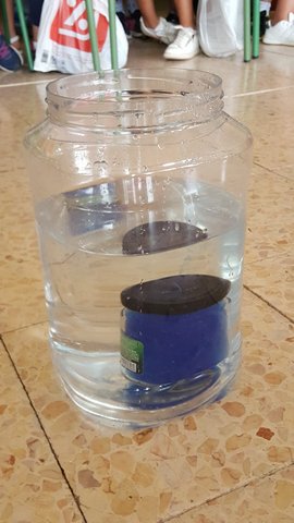 Hoy, Álvaro de 5º, ha traído un experimento a clase que se llama volcán submarino, que consiste en introducir un frasco pequeño y agujereado, con agua caliente coloreada, en otro frasco grande con agua fría .