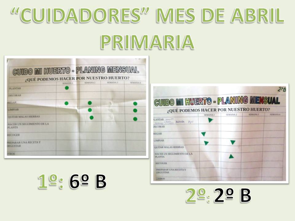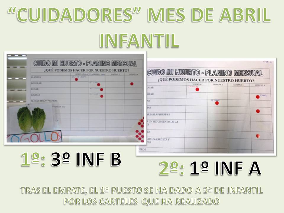 A COMIENZOS DEL MES PASADO PLANTAMOS EN NUESTRO HUERTO ESCOLAR DISTINTAS VARIEDADES DE LECHUGAS Y PUSIMOS EN MARCHA LA ACTIVIDAD «CUIDO MI HUERTO». CADA CLASE TIENE SU TROCITO DE HUERTO QUE TIENE QUE CUIDAR REALIZANDO DISTINTAS TAREAS (PLANTAR, REGAR, LIMPIAR, DECORAR…). EN UN PLANNING MENSUAL CADA CLASE VA ANOTANDO LAS TAREAS REALIZADAS POR SEMANAS Y AL FINAL DE MES SE HACE UNA CLASIFICACIÓN. ¡AQUÍ ESTÁN LOS MEJORES CUIDADORES DE ESTE MES DE ABRIL! ¡ENHORABUENA!