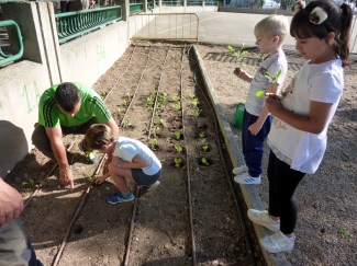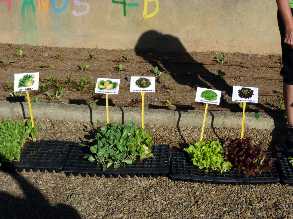 Pusimos diferentes clases de ensaladas, espinacas… Michel y César nos ayudaron haciendo pequeños agujeros en la tierra.