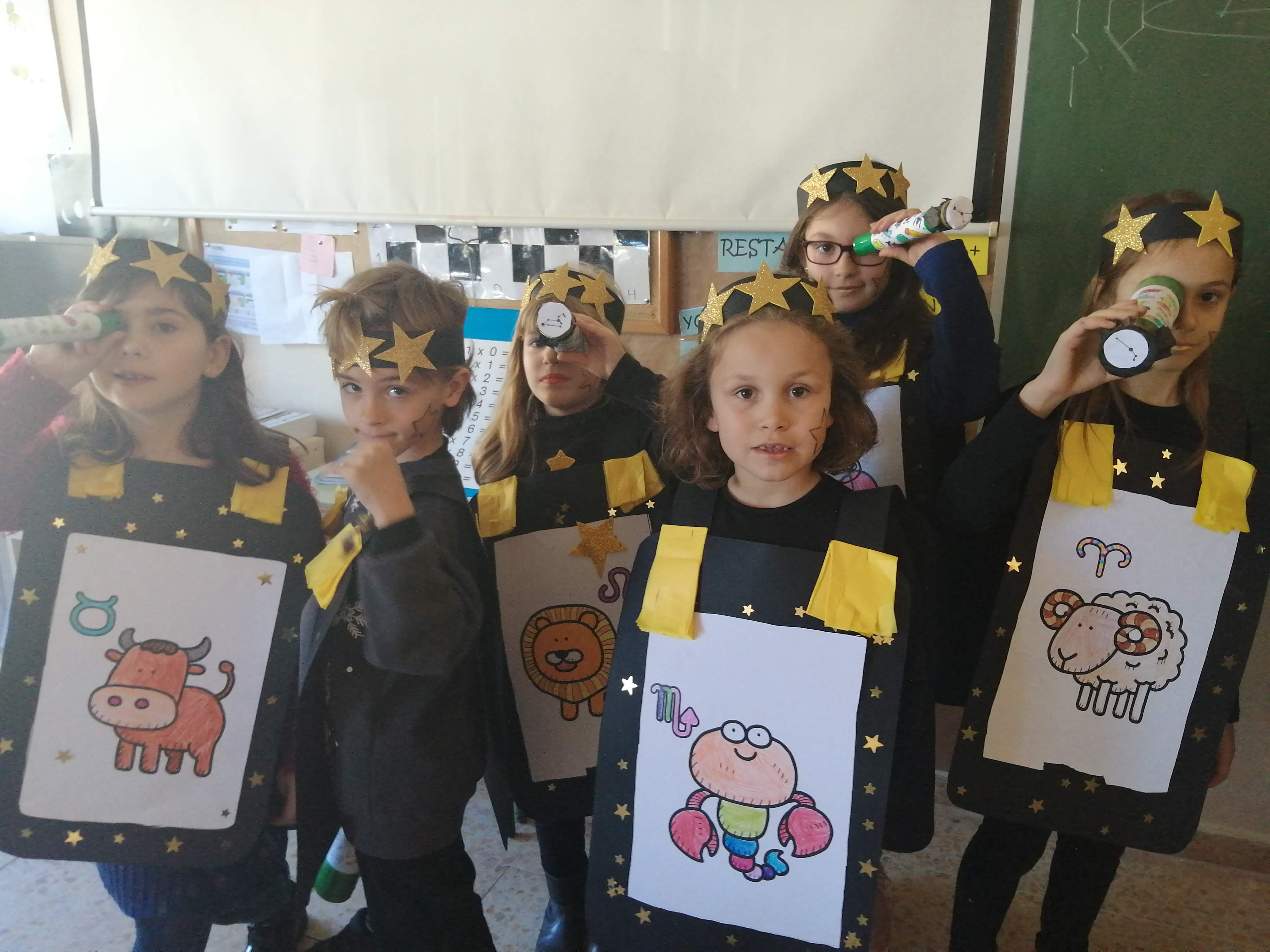 Después, nosotros fuimos añadiendo elementos a nuestro disfraz. Por una parte el dibujo de cada signo y por otra parte dibujamos la constelación pegando estrellas doradas. También nos hicimos una vistosa didema llena de estrellas.