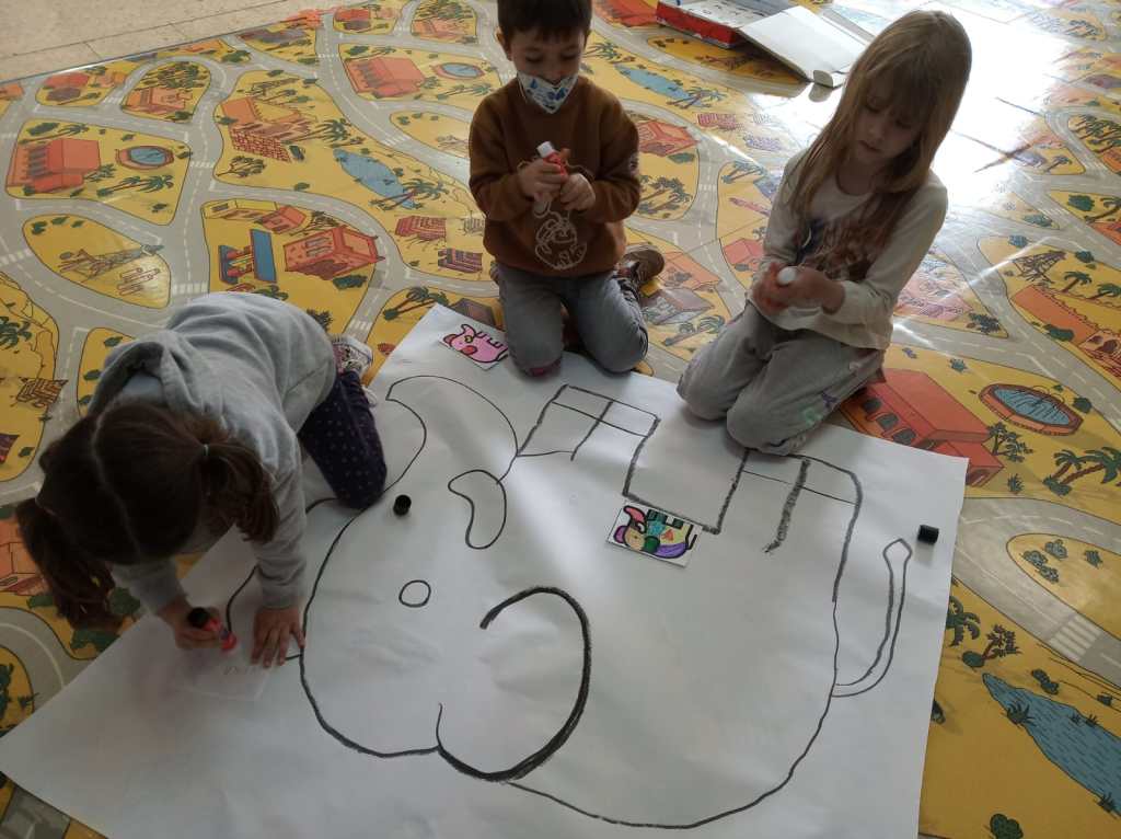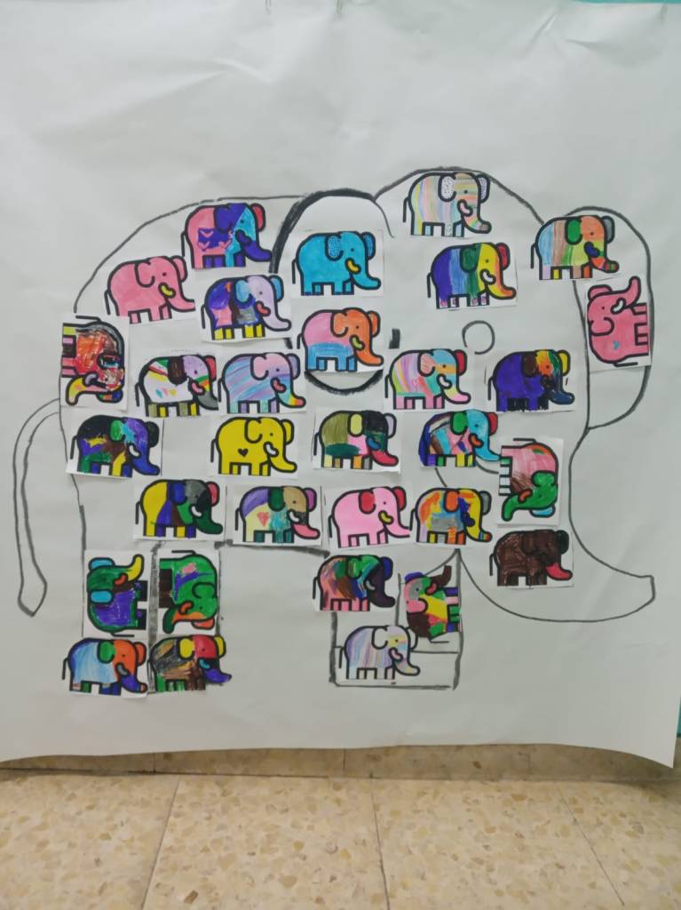 El alumnado de Infantil trabajó el cuento Rosa Caramelo. Cada niño/a pintó un elefante pequeño para luego pegarlo en un súper elefante.