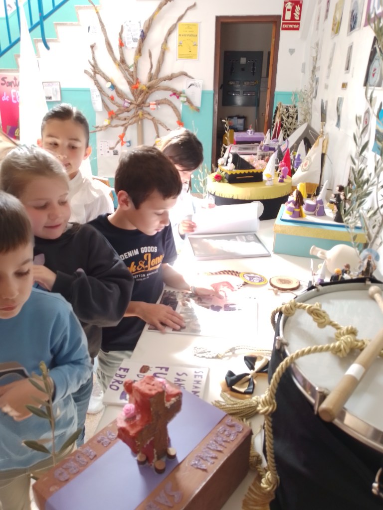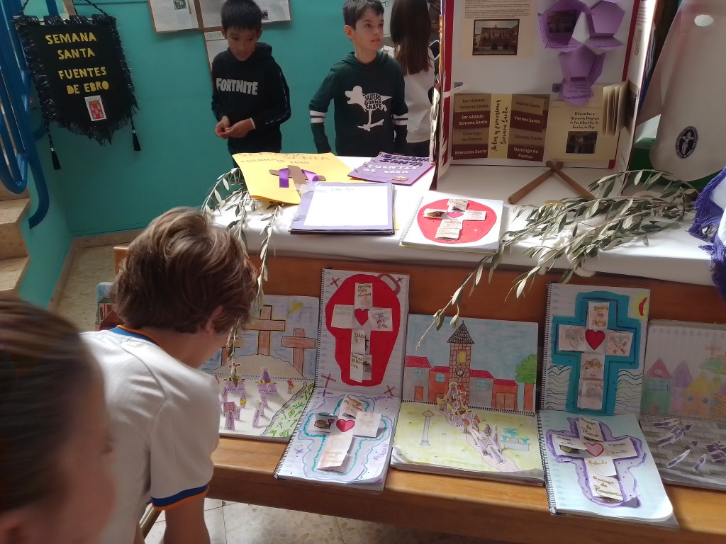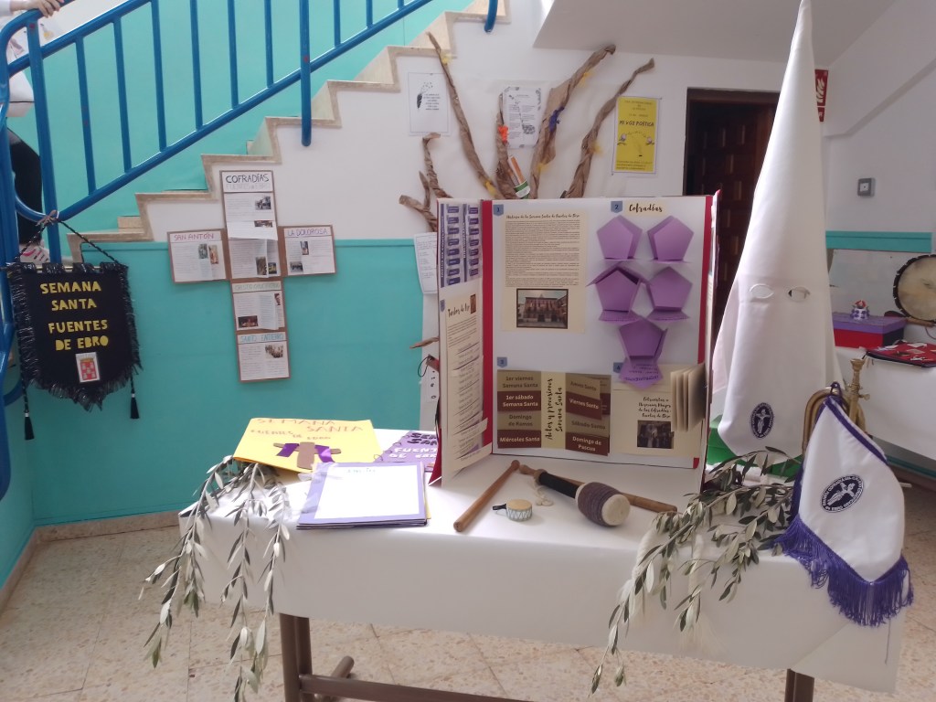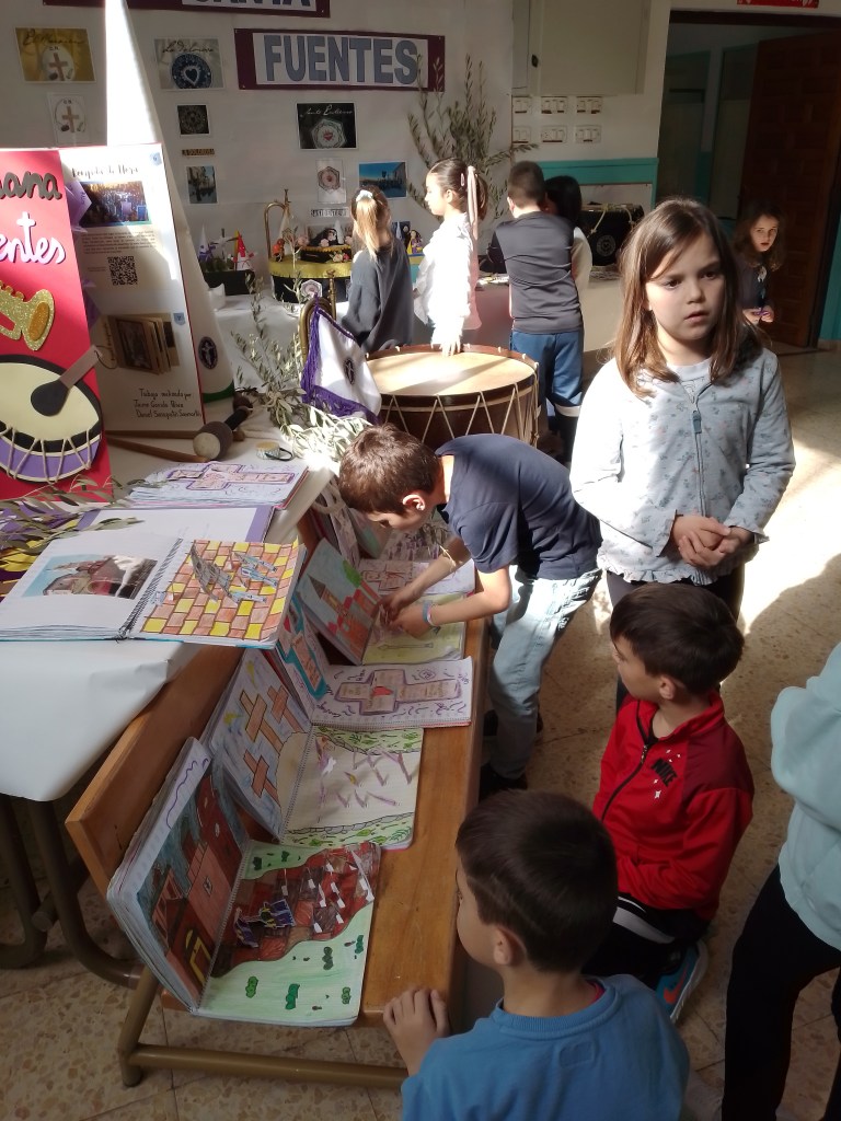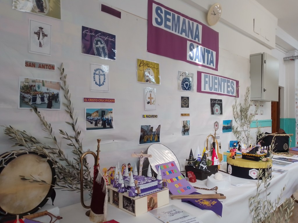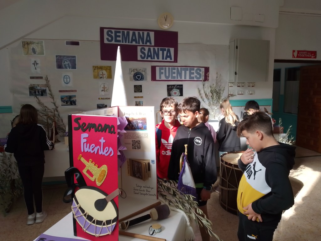 Estos días todos los chicos y chicas del cole estamos viendo la exposición que hemos preparado con motivo de la Semana Santa de Fuentes. Hemos podido tocar instrumentos como la corneta, la trompeta, el tambor y un gran bombo. Además también hemos visto los trabajos tan bonitos que han hecho nuestros compis de 5º,llenos de información, fotografías ,entrevistas, curiosidades,…y con unas presentaciones muy originales y preciosas. Desde aquí les felicitamos a todos/as. 3º y 4º también contribuimos con nuestras procesiones y nuestras cruces decoradas.