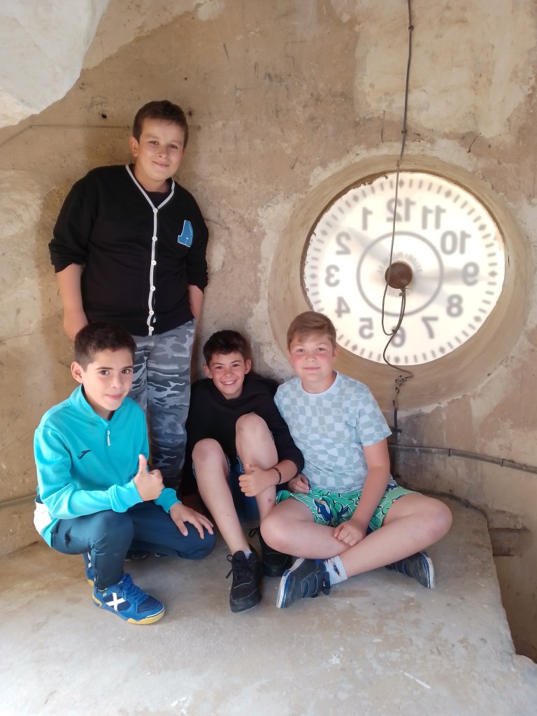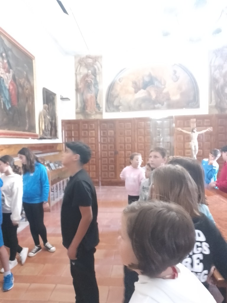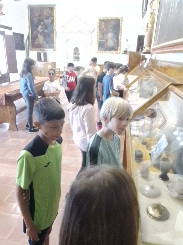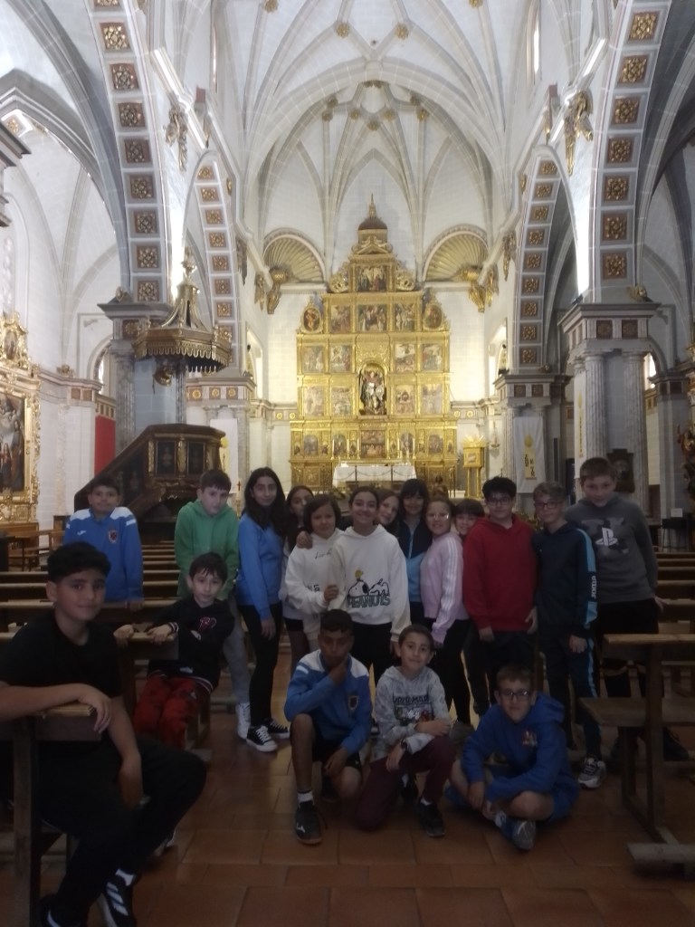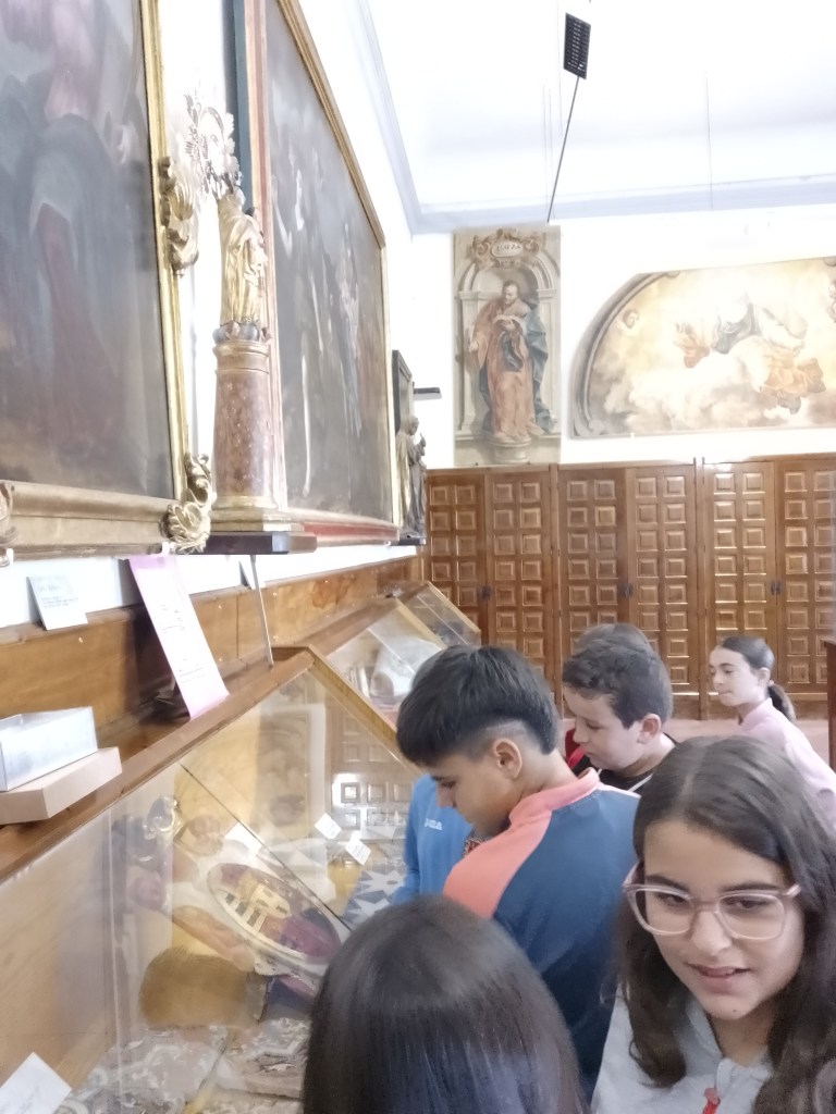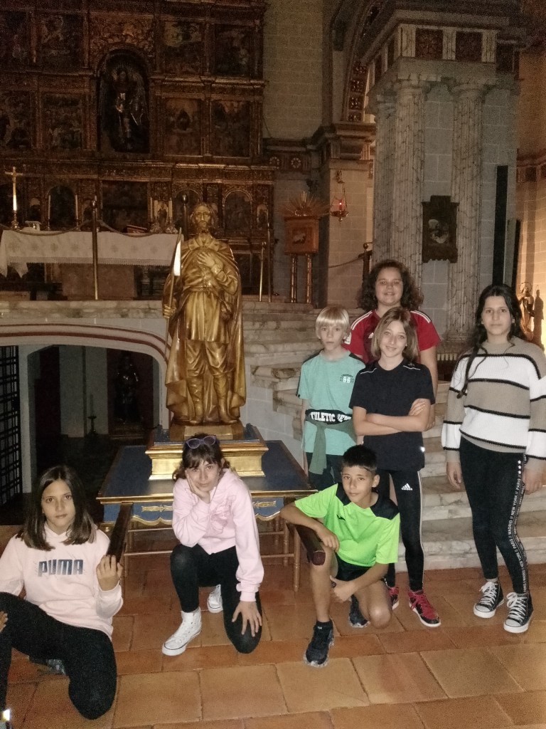 Además de subir y ver muchas curiosidades de la torre también tuvimos la oportunidad e entrar en la sacristía. Allí pudimos ver y tocar libros antiguos escritos en latín y que servían de cantorales. Observamos el cuadro dedicado a santa Bárbara y desciframos algunos de sus misterios; vimos el escudo completo de Fuentes y muchos otros objetos y vestimentas curiosas. Y ya que estamos en prefiestas nos hicimos una foto con San isidro.