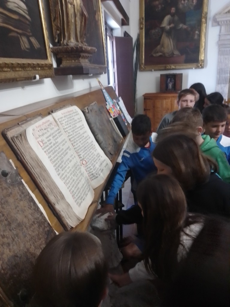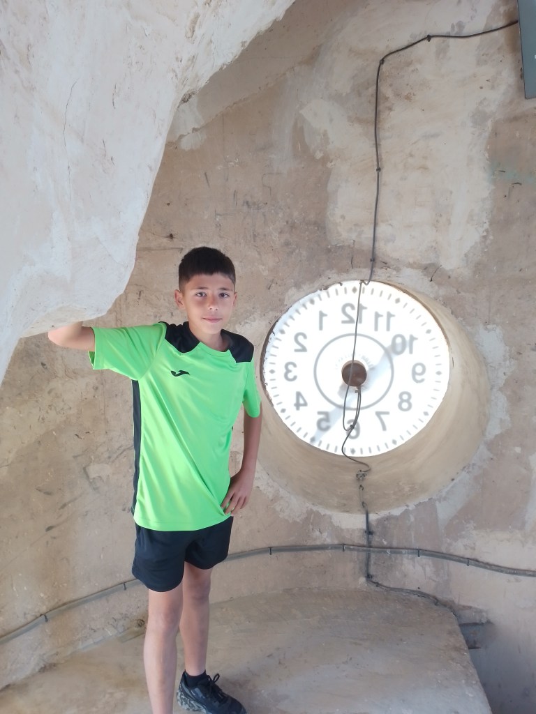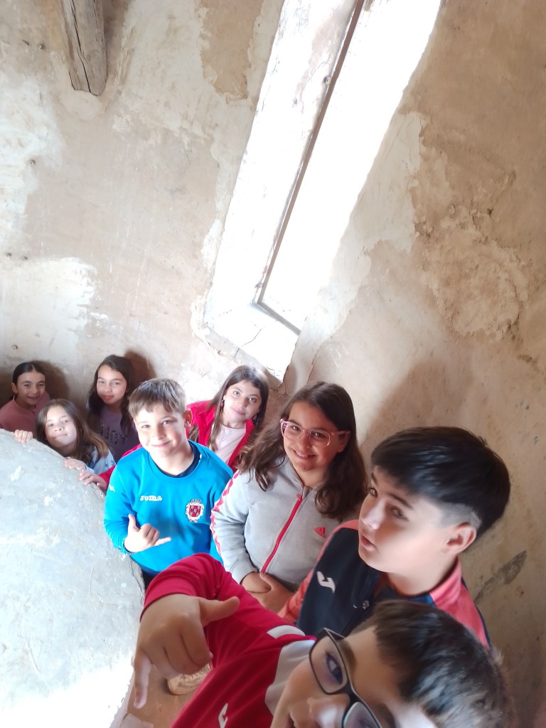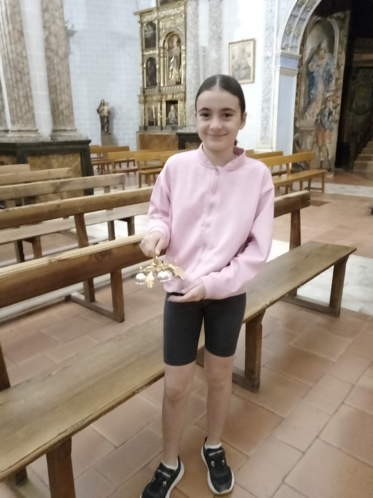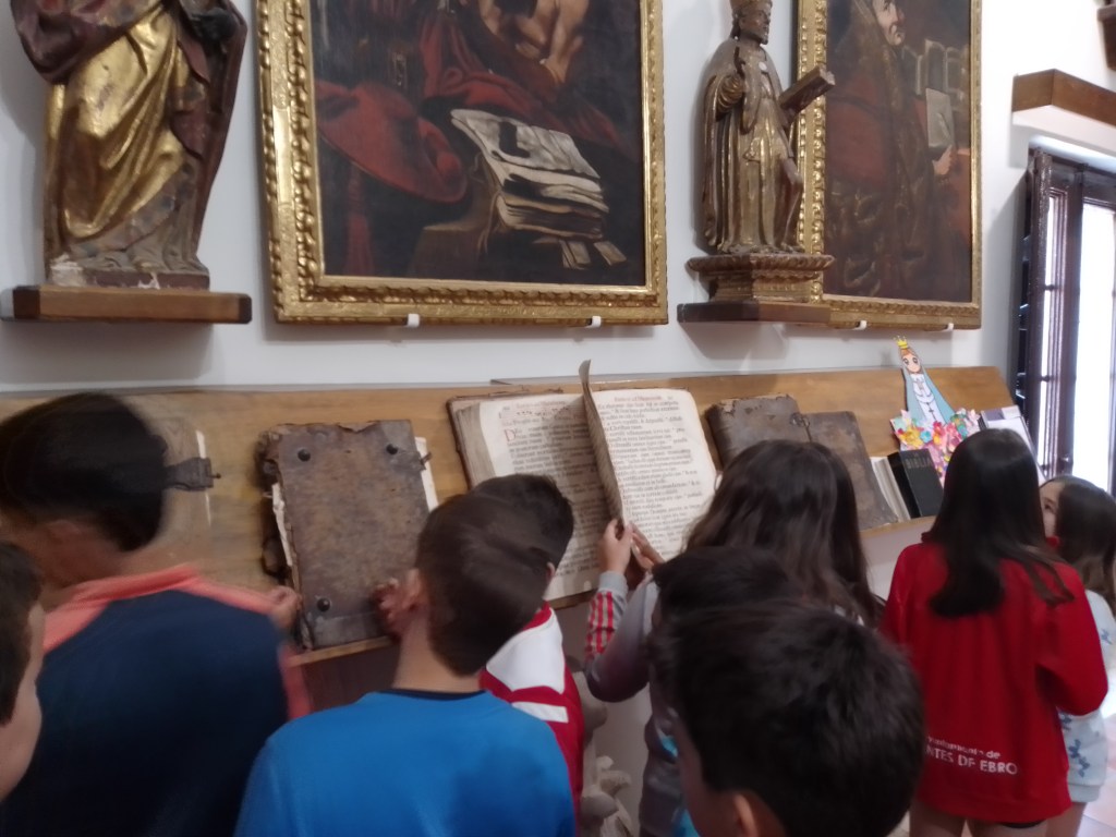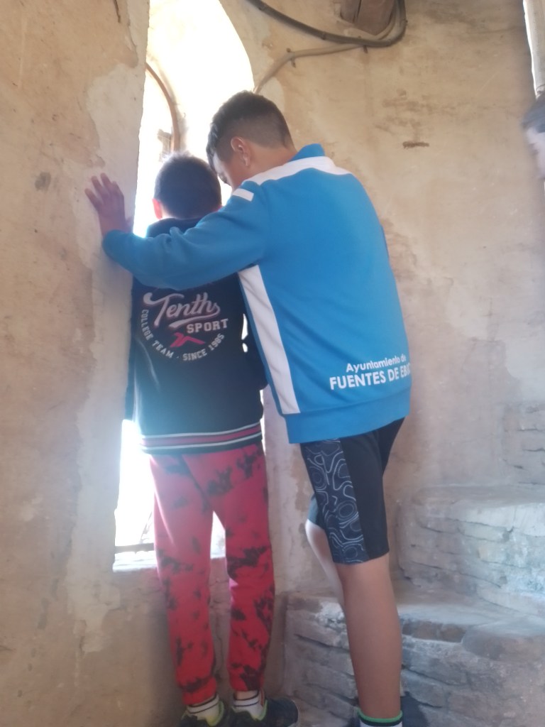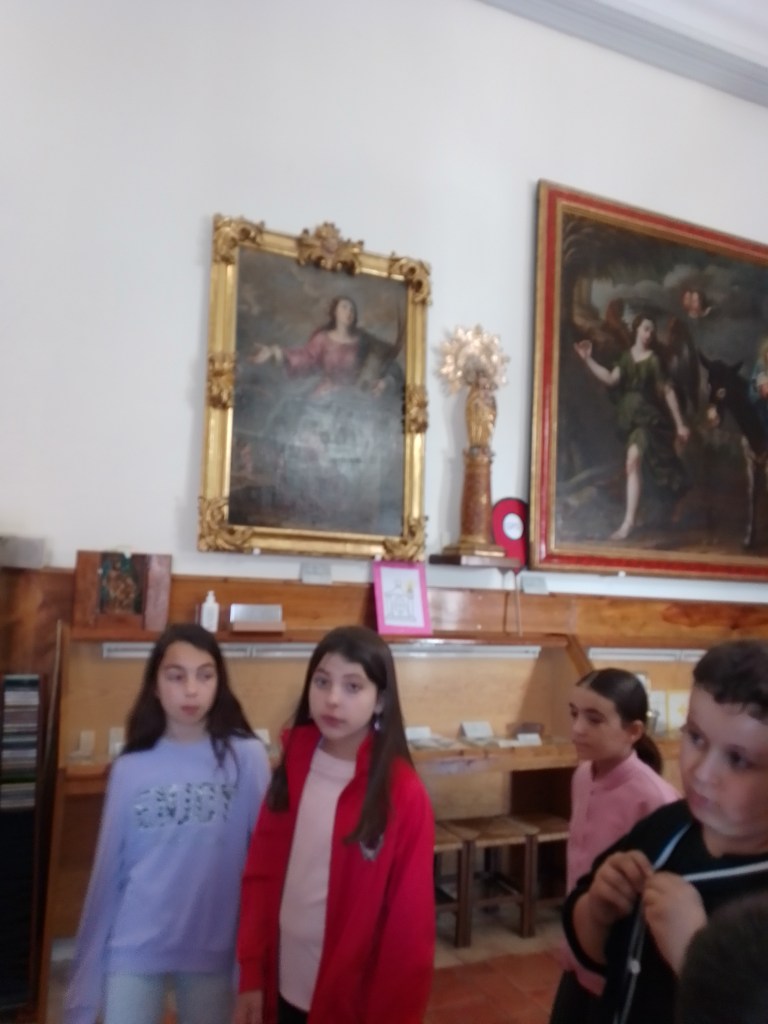 Además de subir y ver muchas curiosidades de la torre también tuvimos la oportunidad e entrar en la sacristía. Allí pudimos ver y tocar libros antiguos escritos en latín y que servían de cantorales. Observamos el cuadro dedicado a santa Bárbara y desciframos algunos de sus misterios; vimos el escudo completo de Fuentes y muchos otros objetos y vestimentas curiosas. Y ya que estamos en prefiestas nos hicimos una foto con San isidro.