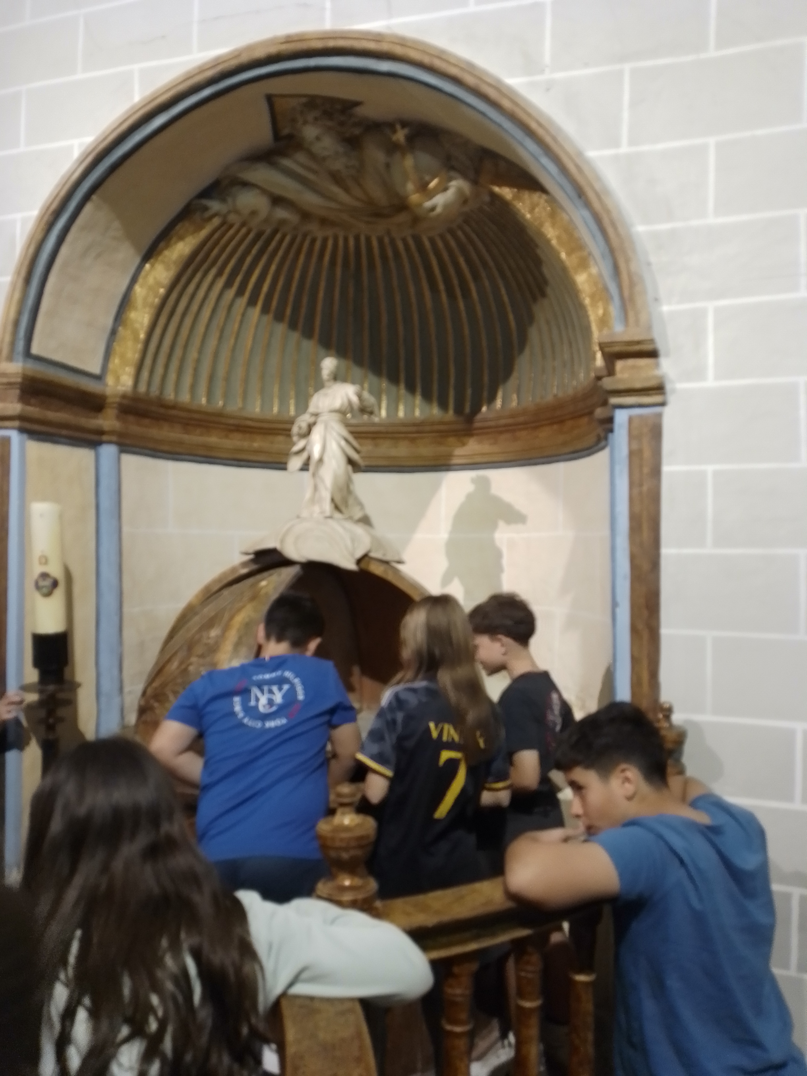 Un altar dedicado a San Jorge, La talla de una Virgen del siglo XIV, una pila bautismal realizada por Joaquin Aralí Solanas, el retablo mayor de San Miguel (una joya el renacimiento aragonés), el retablo de San Gregorio( pagado por los vecinos de Fuentes para superar una gran plaga de langostas), … Todo esto y mucho más hemos podido ir descubriendo en nuestro recorrido por las capillas y la cripta.