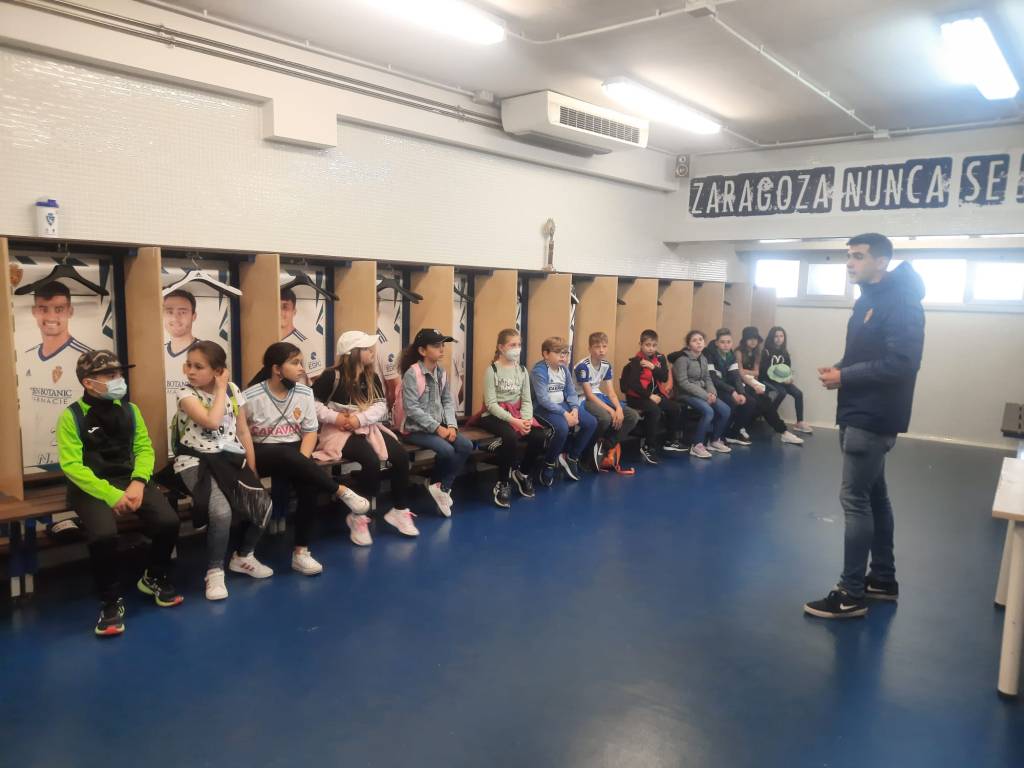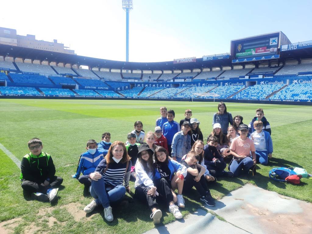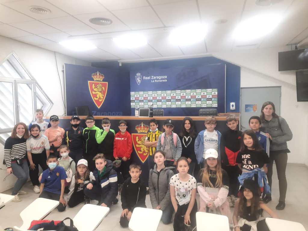 Los alumnos y alumnas de 4º de Primaria visitamos el estadio de la Romareda. Fue una experiencia muy especial, ya que llevábamos mucho tiempo sin hacer una salida. Gracias a las explicaciones del guía conocimos un montón de curiosidad del Real Zaragoza y su estadio (año de construcción, primer partido, remodelaciones…). Tuvimos la suerte de visitar la sala de prensa, los vestuarios, zona mixta y los banquillos.