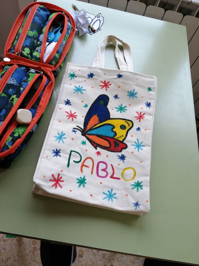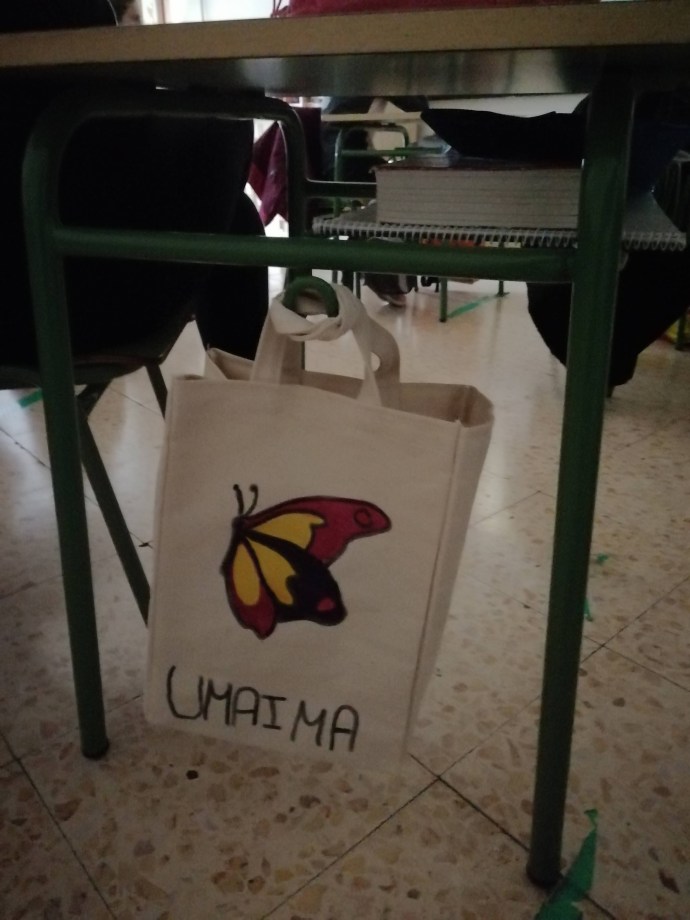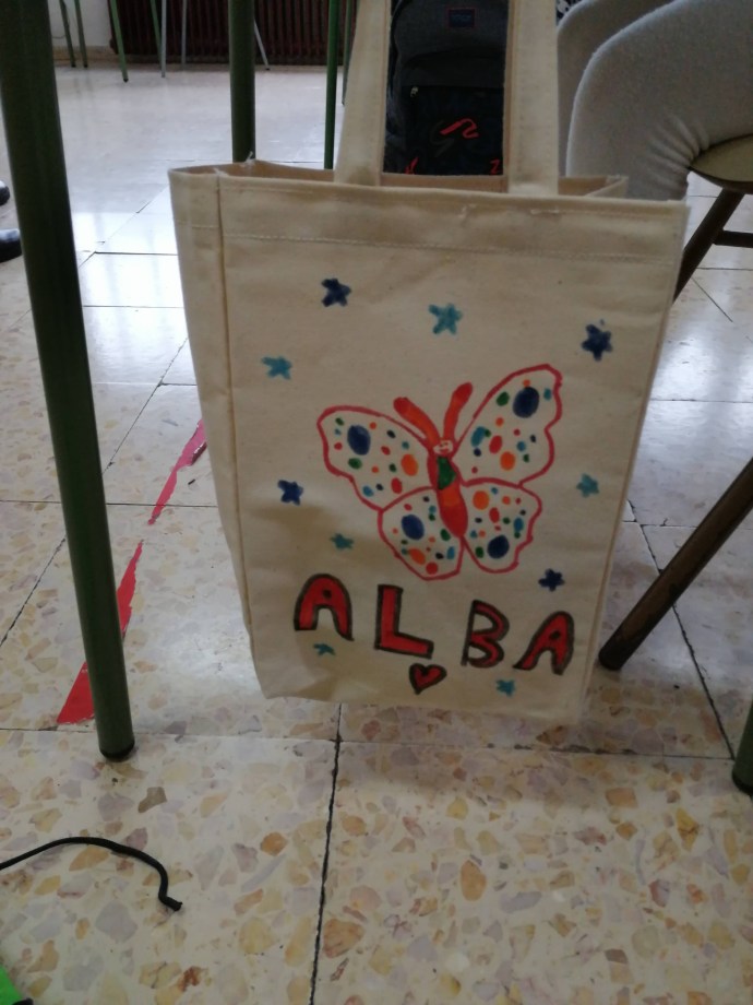 Es la frase que hemos elegido para adornar unas bolsas de tela. Las vamos a utilizar para guardar las servilletas de limpieza.