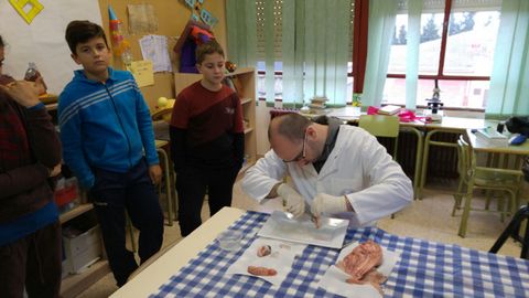 El día martes 13 de diciembre, vino Víctor, un veterinario, a nuestra escuela.Nos ayudó a extraer el cristalino de un ojo de cordero. Trajo media cabeza de cordero, con 2 ojos y cerebro. Pudimos observar todo el interior a simple vista y nos pareció muy interesante. El humor vítreo es negro y la retina irisada, también Víctor nos explicó que la forma de los ojos de los herbívoros no son totalmente circulares y que sólo tienen dientes en la parte de abajo de la boca, ya que sólo necesitan rumiar. Luego cogió un ojo y lo abrió para sacar el cristalino.