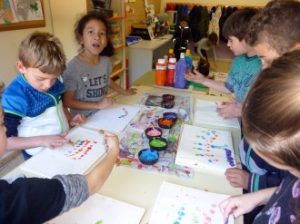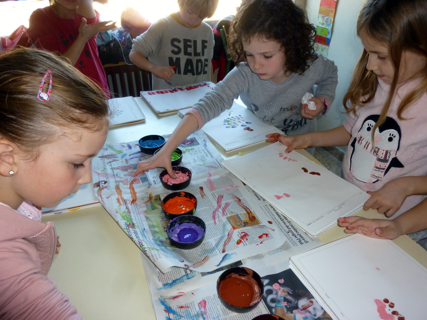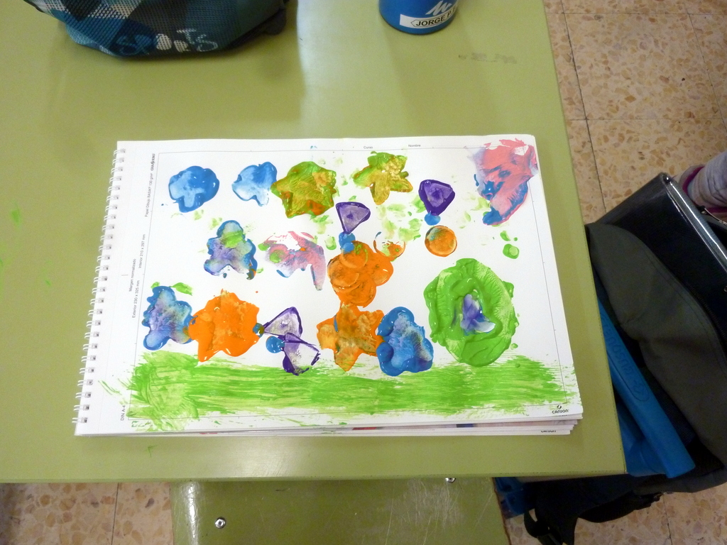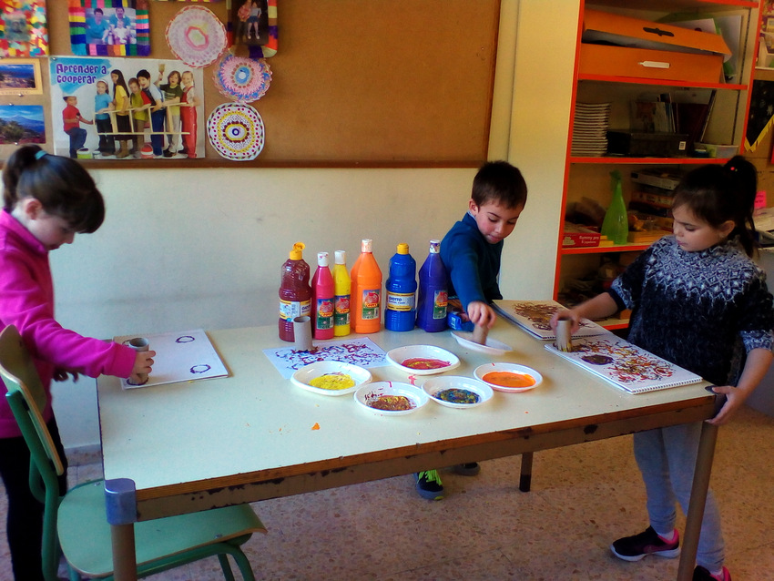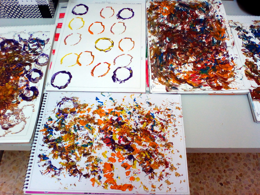Mojamos las diferentes formas en témperas de colores y cada uno hizo su composición en el bloc.