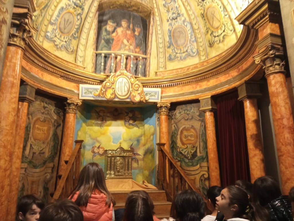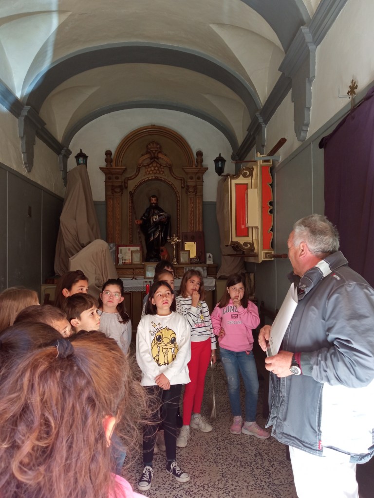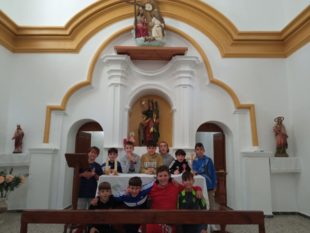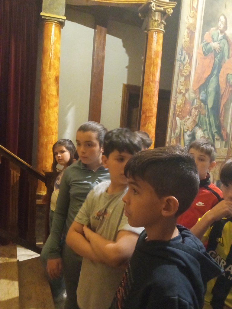 Hoy hemos tenido la oportunidad de ver el valle que se divisa desde lo alto de la torre de la iglesia( como lo hicieron hace años durante la guerra civil española. Entonces la torre sirvió de torre de vigilancia ante el enemigo y en su restauración se encontraron restos de artillería de aquella época) . Nuestra clase de reli ha sido diferente: hemos salido del aula para ver de cerca, tocar, conocer ,…. diferentes objetos, ropajes, y obras artísticas que se encuentran en la sacristía , también hemos visto como está construida la torre por dentro( a partir de un cilindro se iban disponiendo los escalones formando un torbellino que formaba la escalera de caracol).
